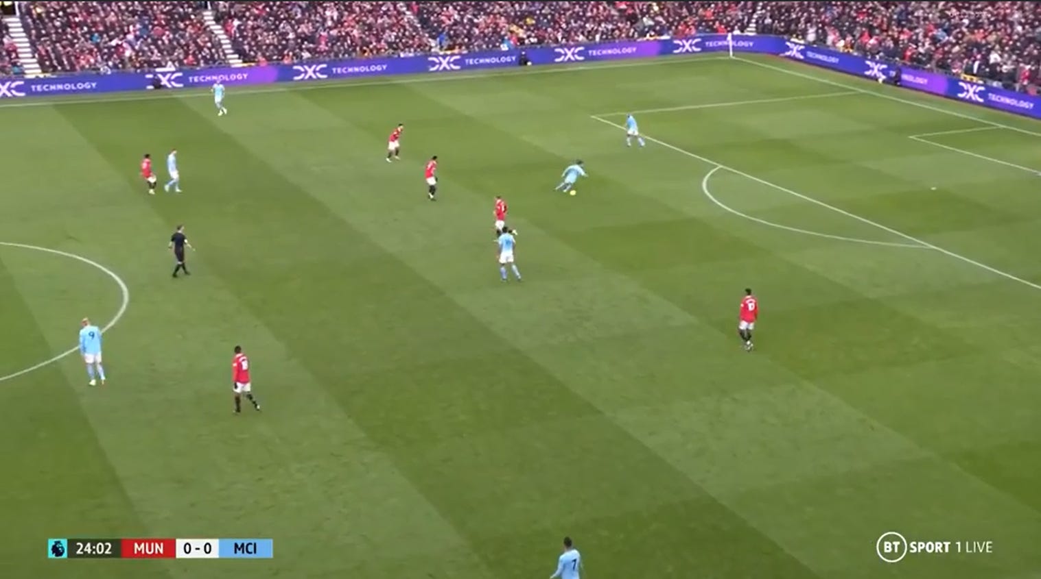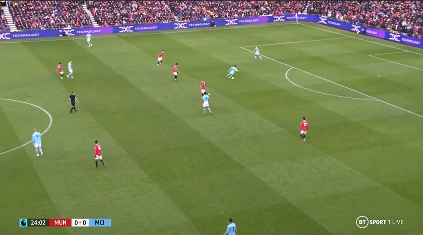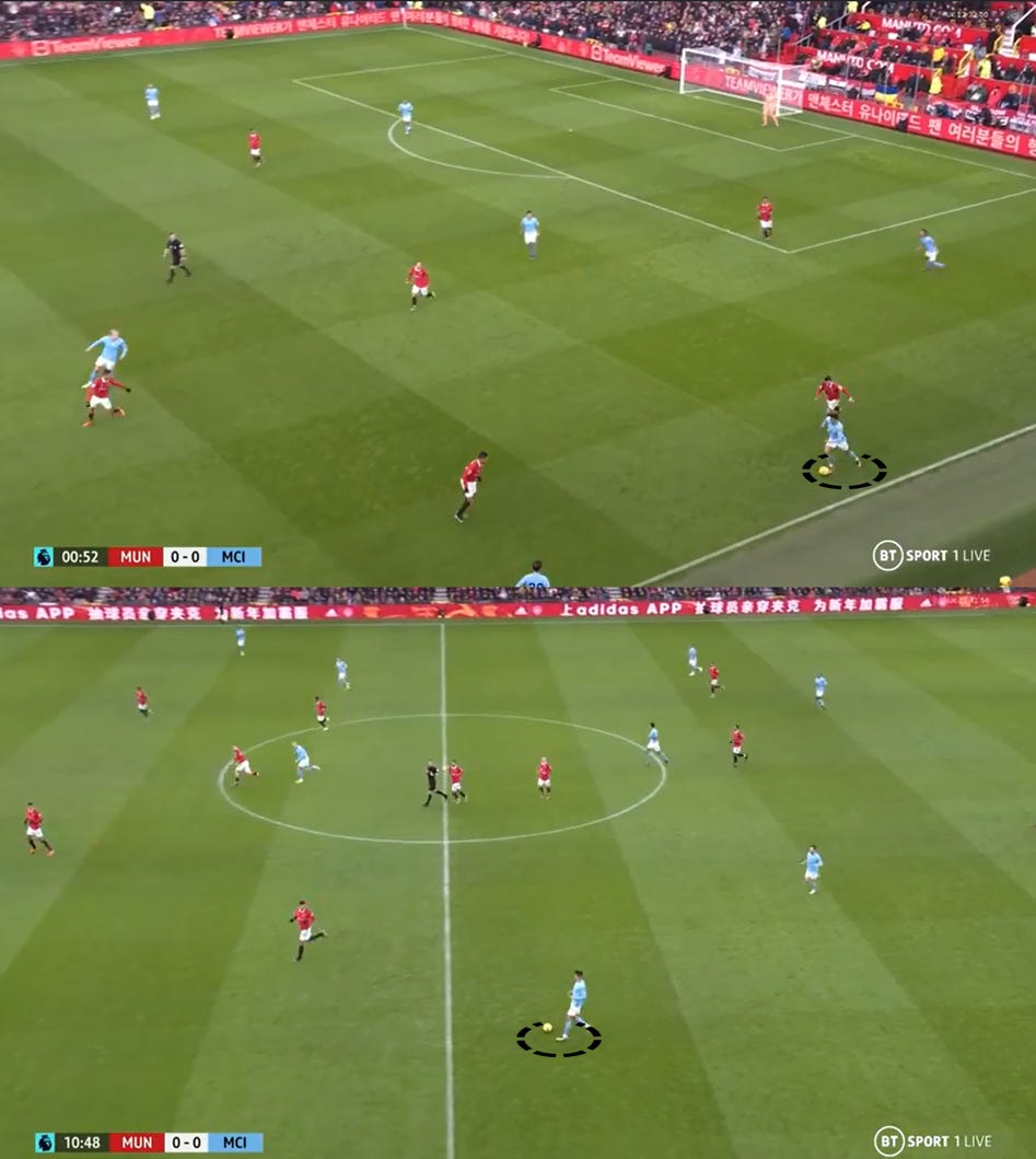 تحركات رباعي دفاع اليونايتد كانت منظمة وده مكنش بيدي مساحات للسيتي حتي لما بيقدر يخرج من ضغط اليونايتد.