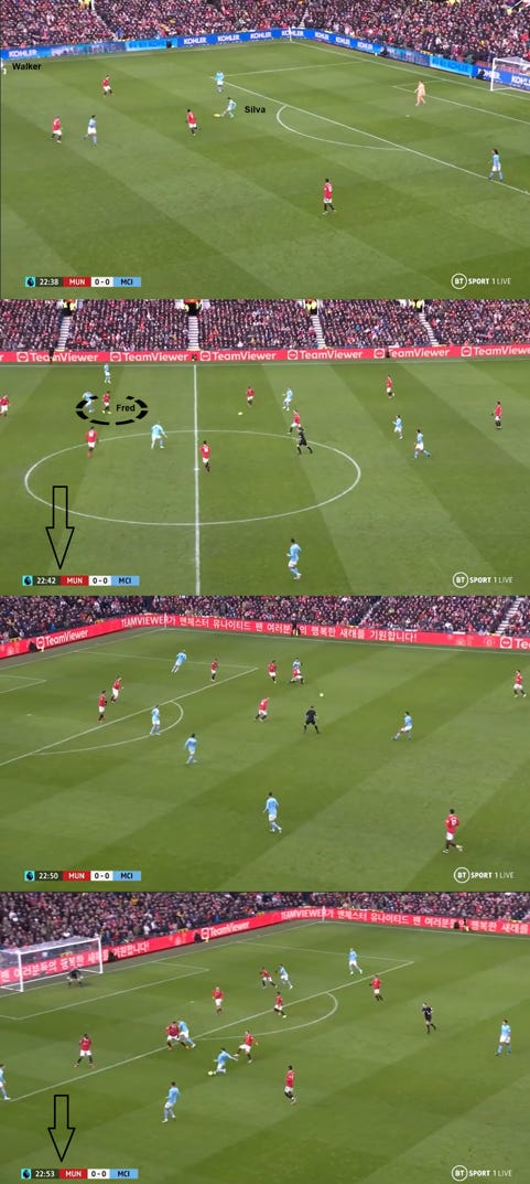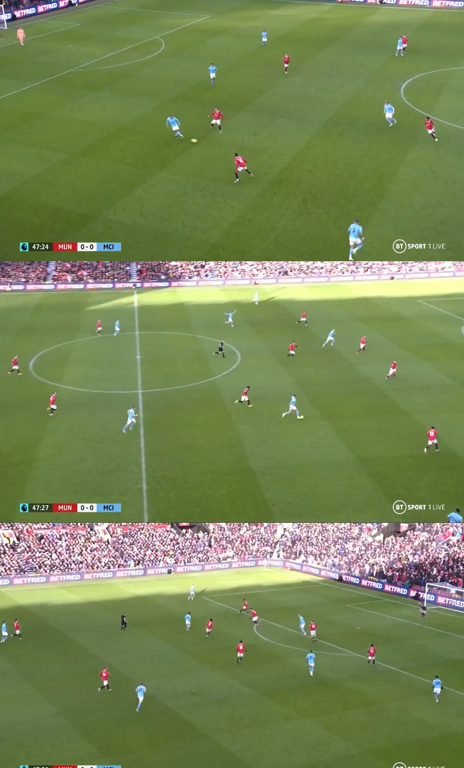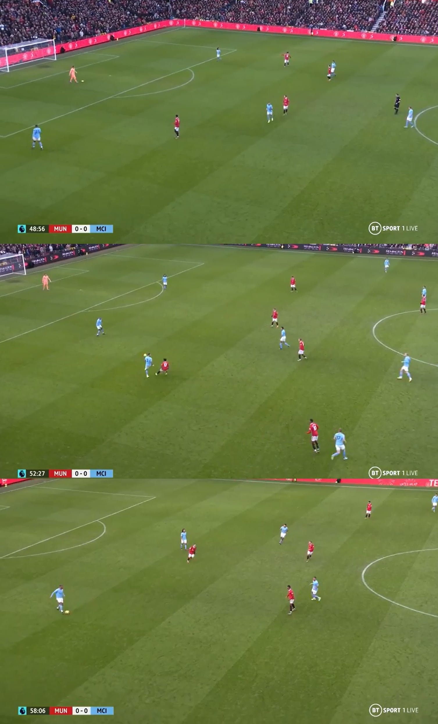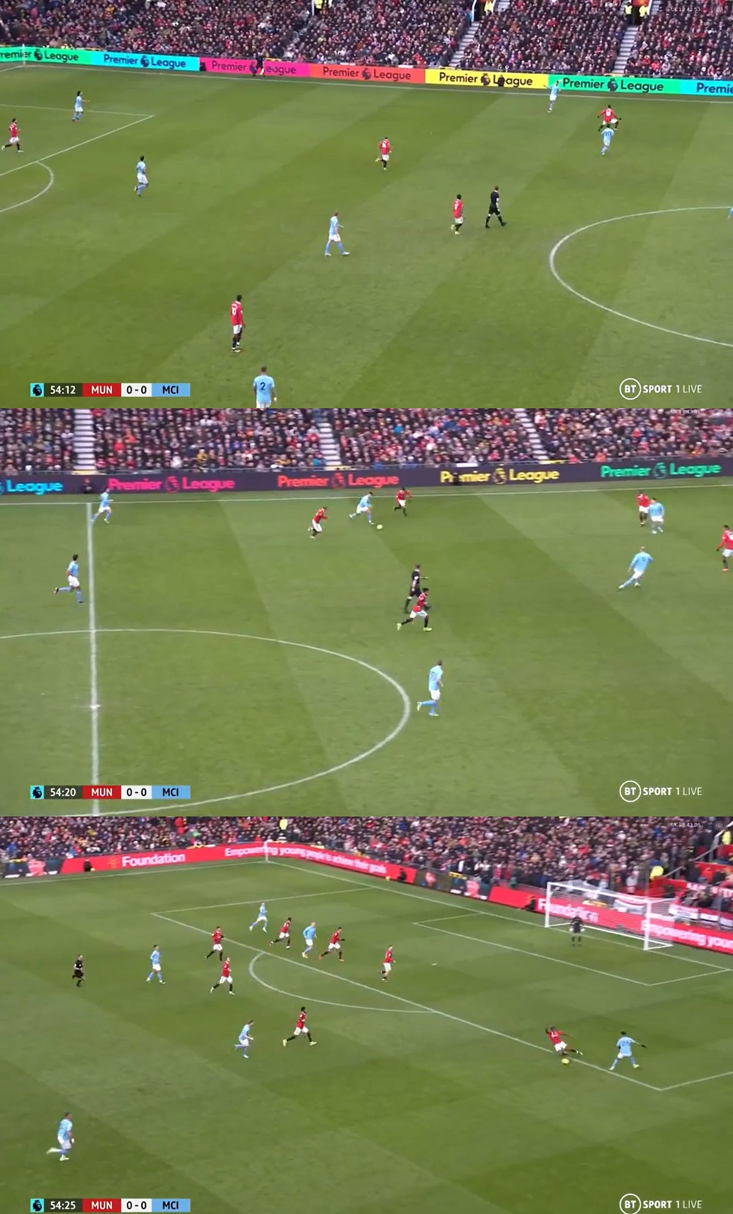 في الكرات دي لما كان بيقدر السيتي يعدي خط ضغط اليونايتد، كان بيتراجع لاعبي وسط اليونايتد بسرعة لنص ملعبهم، في كة الفريق تراجع كله لمنطقة جزائه في أقل من 13 ثانية.