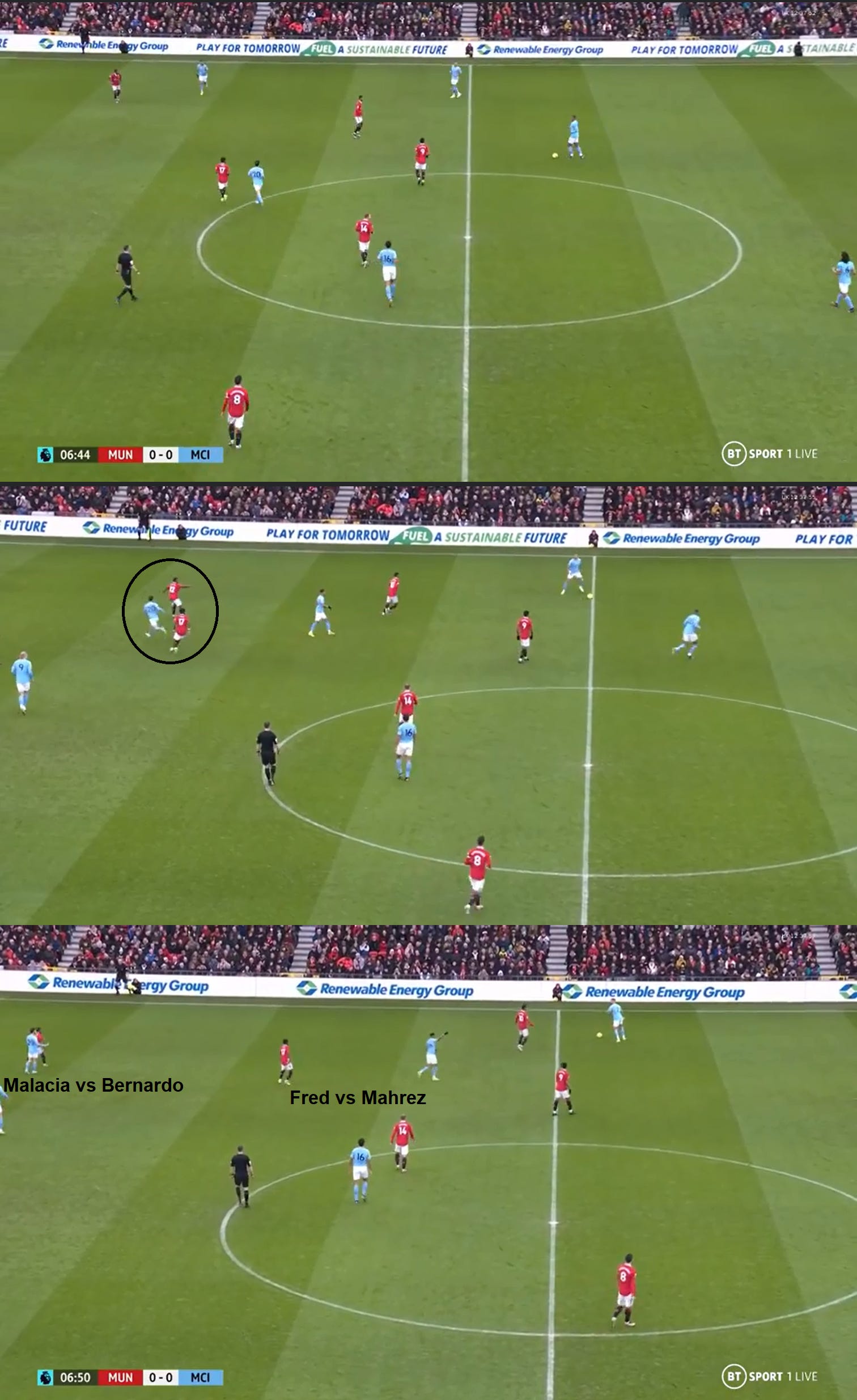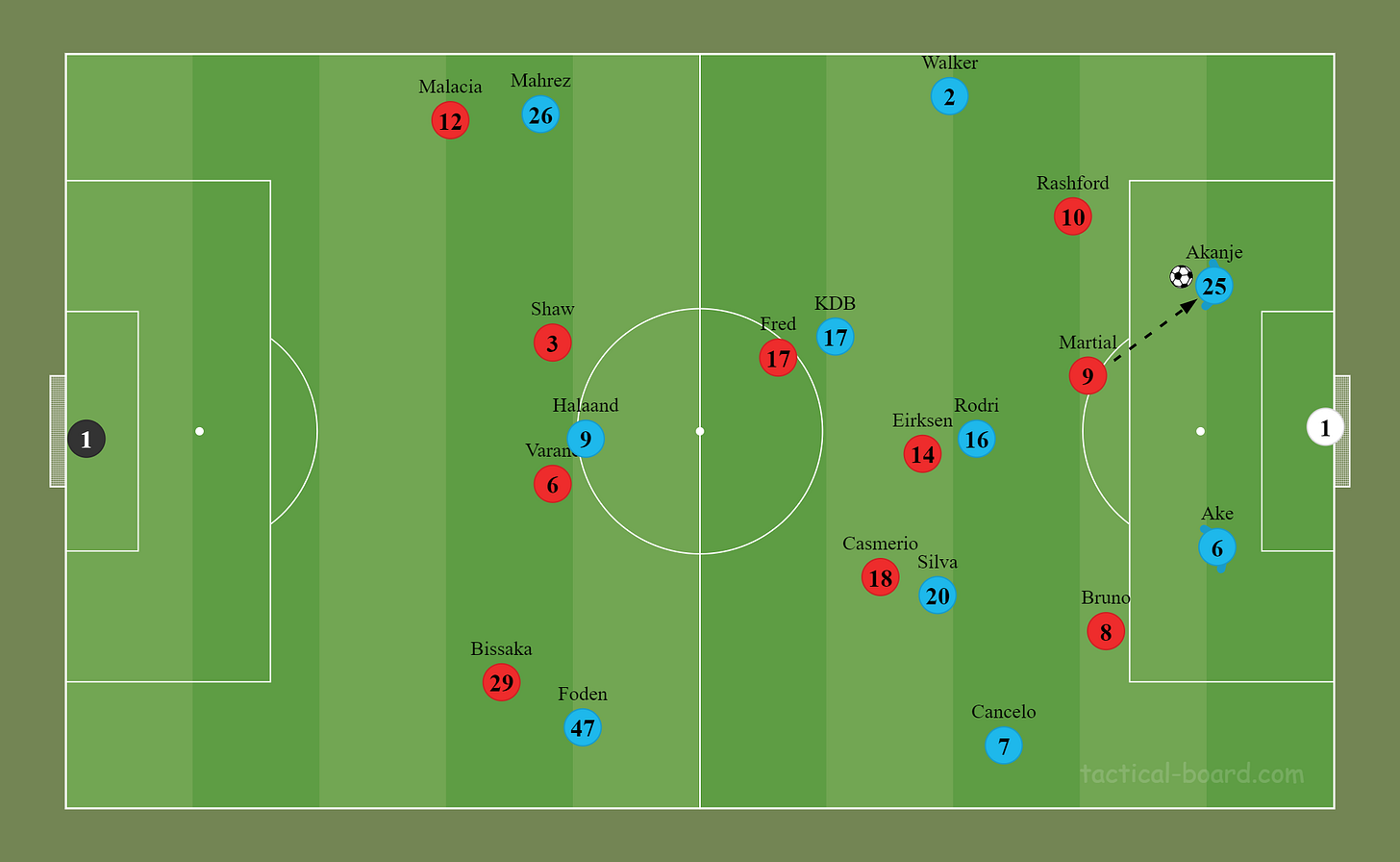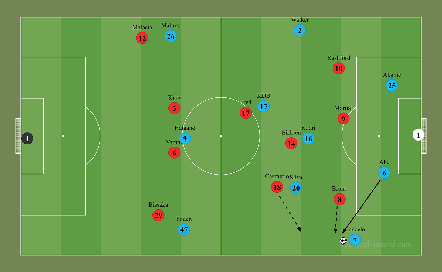 في الضغط المتقدم، اليونايتد كان بيضغط ب 4213، اعتمادًا علي دفاع مان تو مان برقابة ايركسين ل رودري، وفريد لدي بروينه، وكاسميرو لبيرناردو سيلفا.