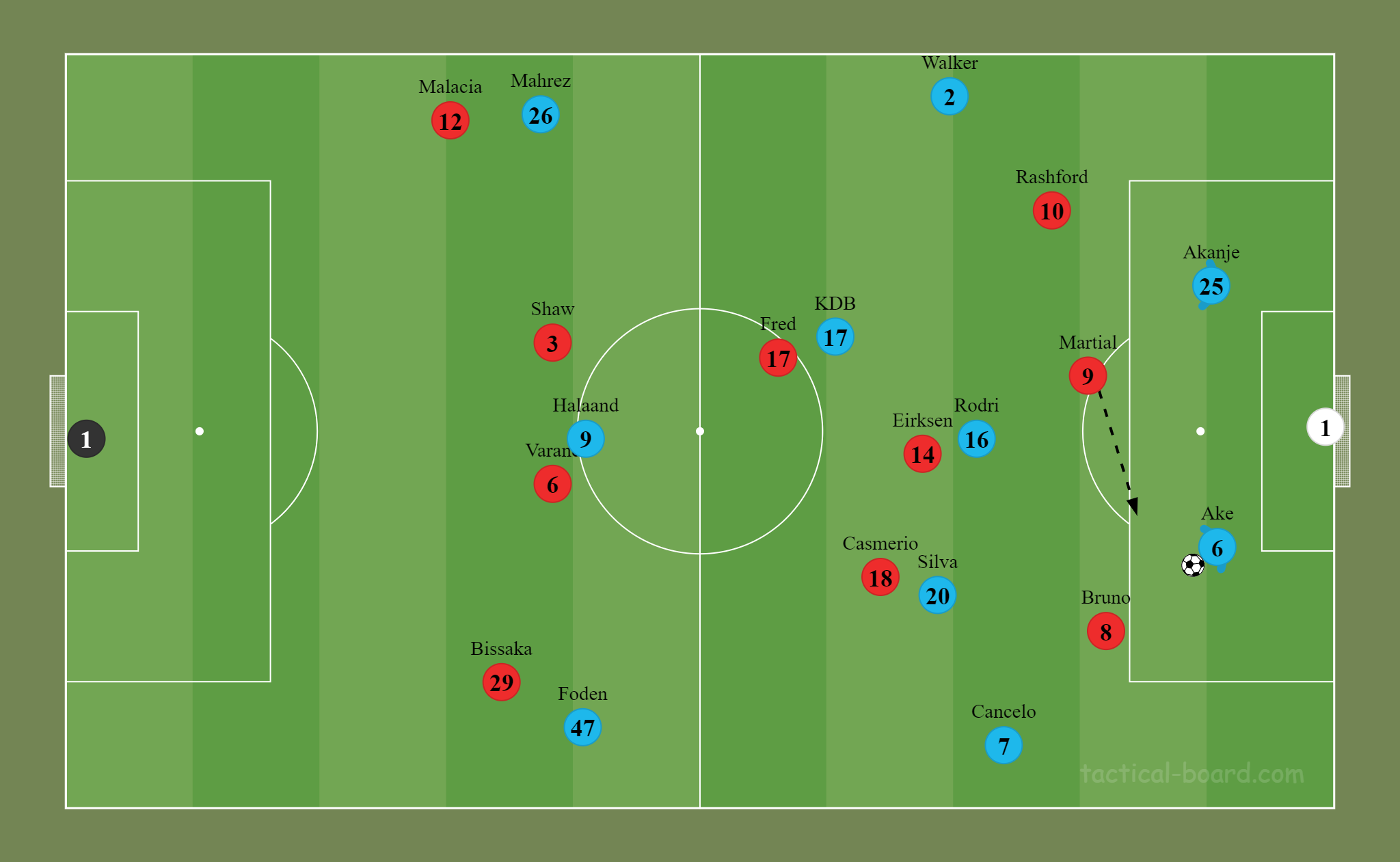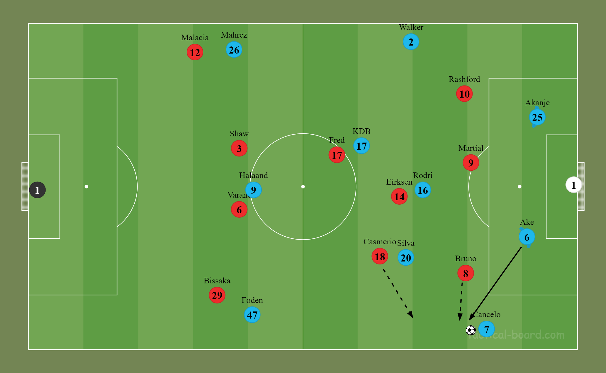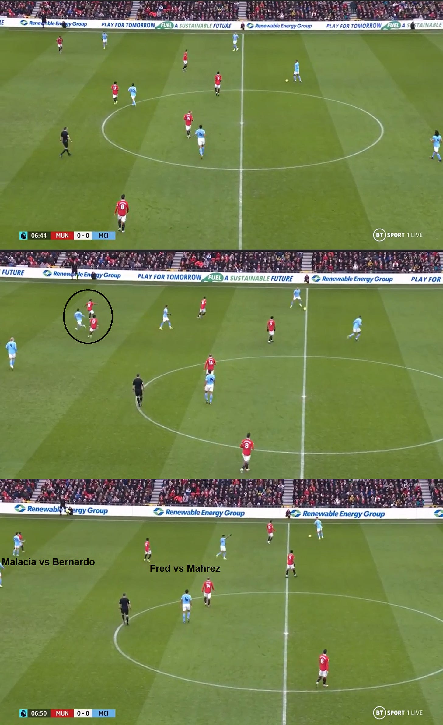 في الضغط المتقدم، اليونايتد كان بيضغط ب 4213، اعتمادًا علي دفاع مان تو مان برقابة ايركسين ل رودري، وفريد لدي بروينه، وكاسميرو لبيرناردو سيلفا.