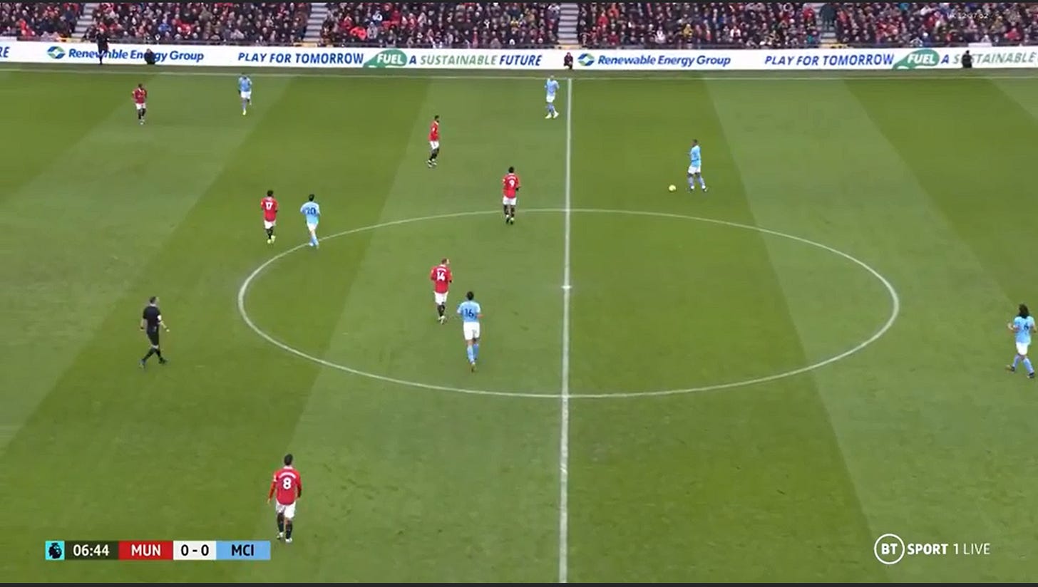 مع وجود الأجنحة راشفورد وبرونو في عمق الملعب بين مساك وباك السيتي، بحيث يقدر يضغط عالمساك وهو قافل زاوية التمرير علي الباك وفي نفس الوقت مدي حماية اضافة لمنع تمرير الكرة في عمق الملعب لدي بروينة او سيلفا.