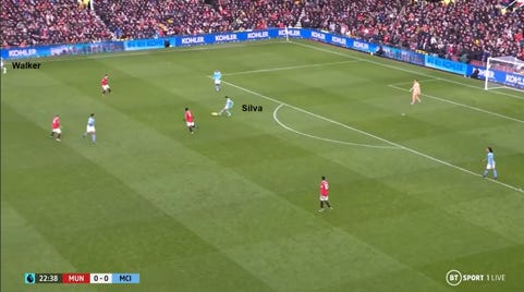 بيرناردو قدر مرتين يخرج باص في ضهر راشفورد لوالكر لكن بعد كدة بدأ يقابل ضغط من برونو اللي بدأ يدخل في العمق أكتر يضغط علي بيرناردو مع قفل زاوية التمرير لوالكر من راشفورد ومارثيال.