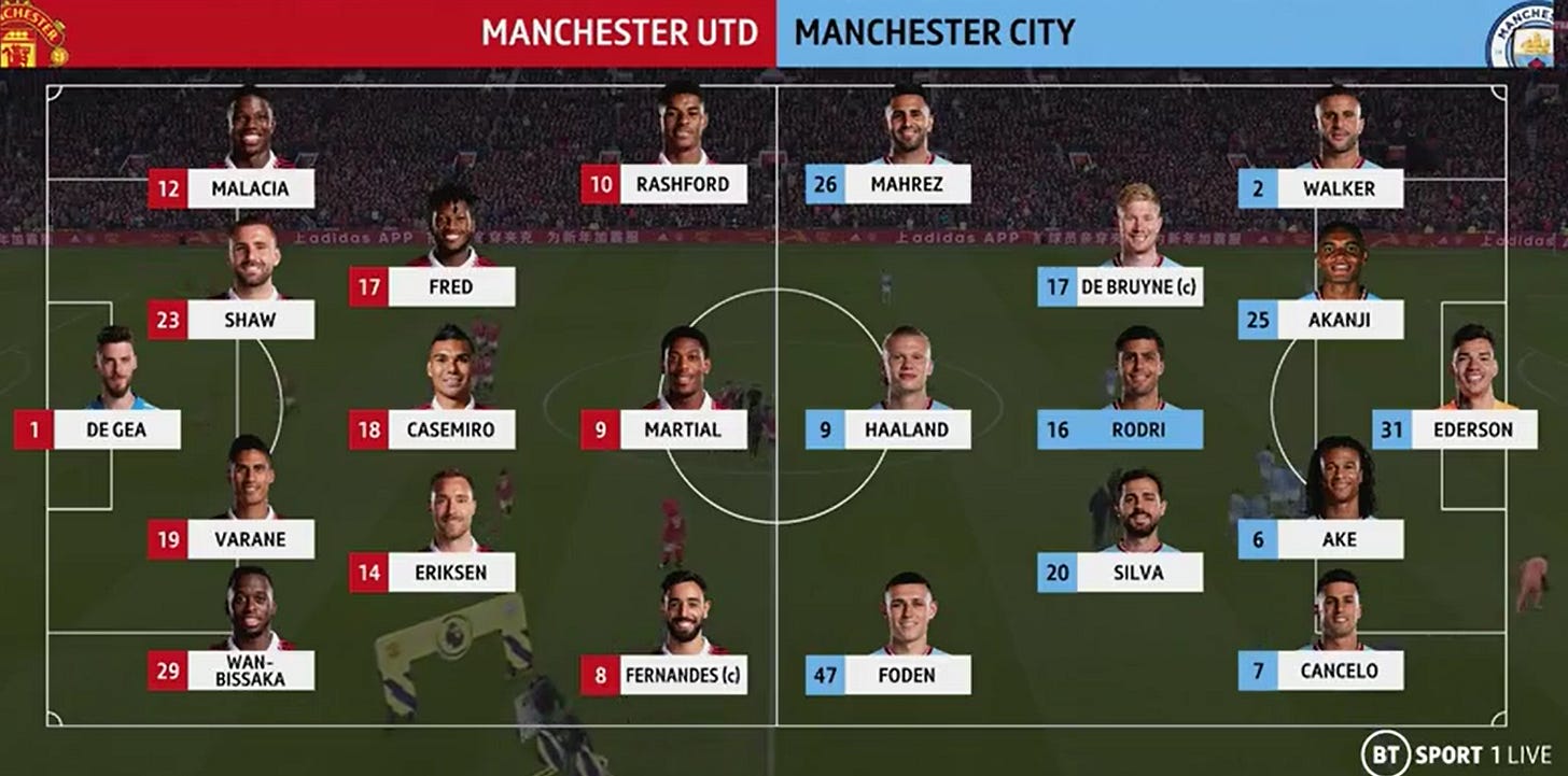 بدأ مانشستر يونايتد المباراة بطريقة 4231 بوجود فريد بجانب كاسميرو كلاعبي ارتكاز، برونو في الجناح اليمين وايركسين في مركز رقم "10". وبدأ مانشستر سيتي ب 4141 بثلاثي وسط رودري وبيرناردو ودي بروينه مع وجود محرز وفودين عالأطراف.