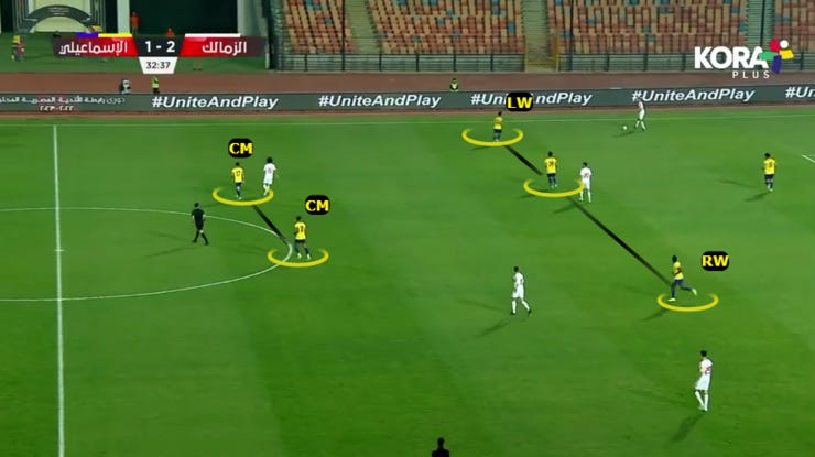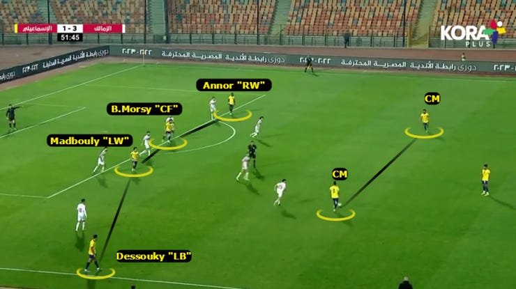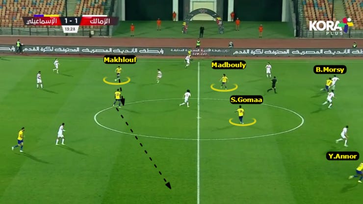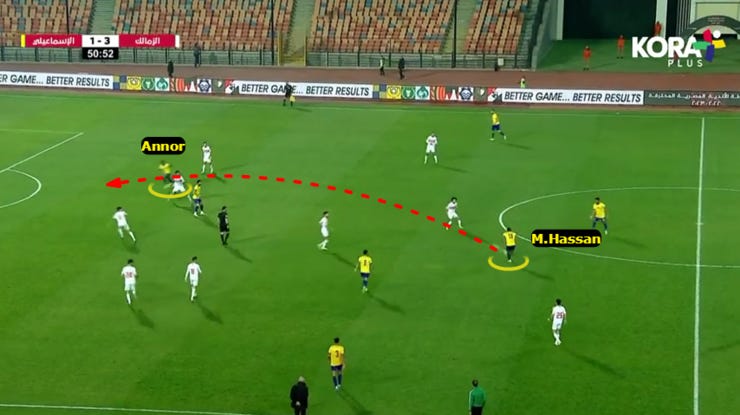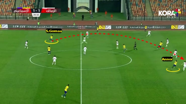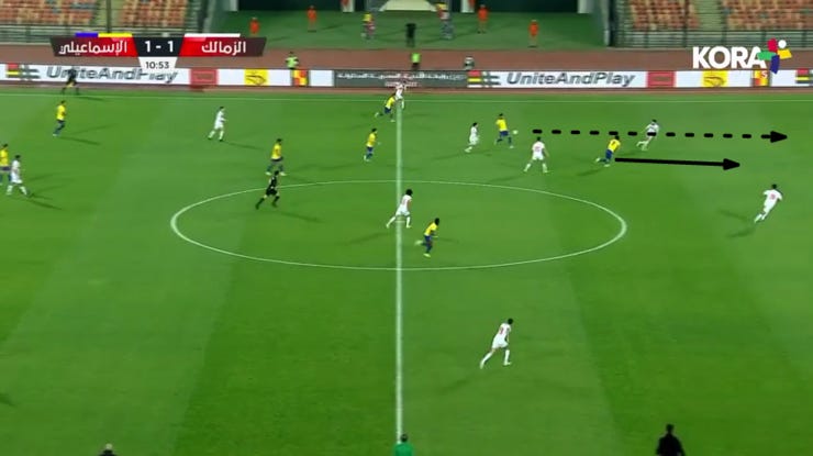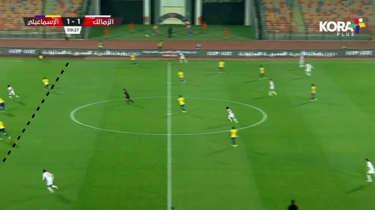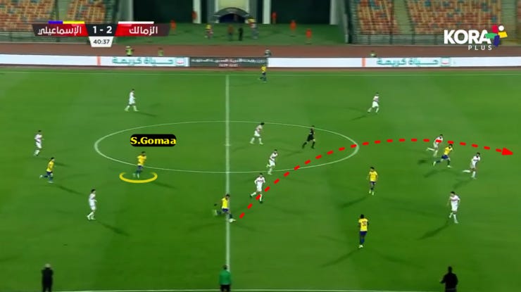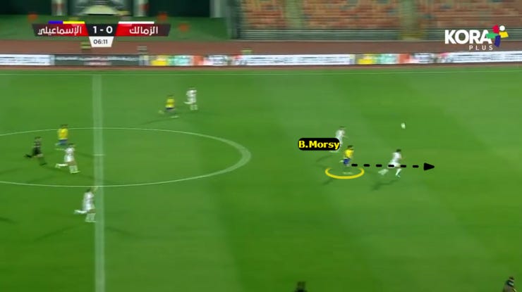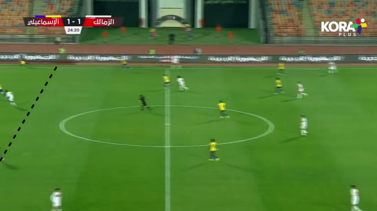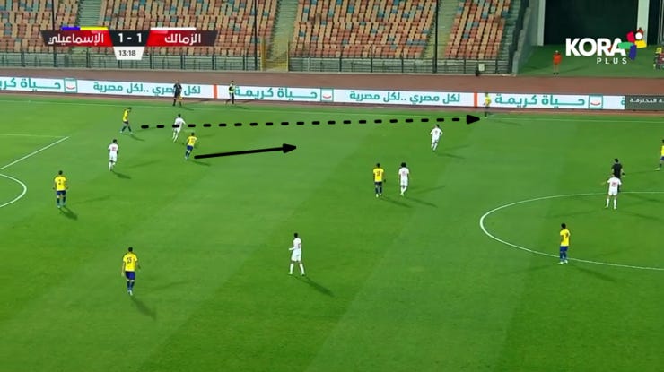 الحاجة التانية لما بدأ الزمالك يضغط بشكل 424 ويضغط بشكل أقوي علي ارتكازين الفريق فبدأنا نلعب كرات طويلة لباسم مرسي في المساحة بين خط نص ودفاع الزمالك.
