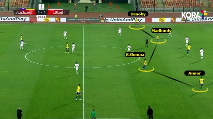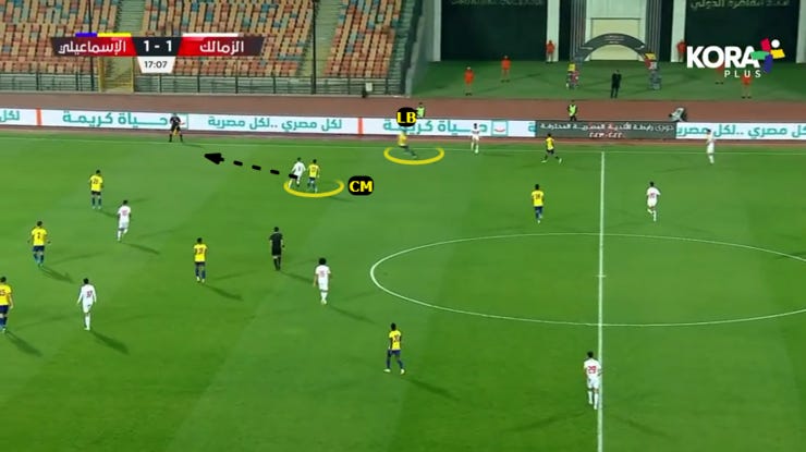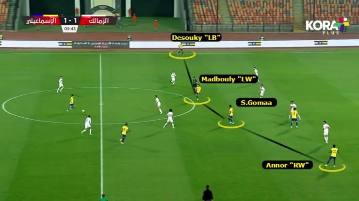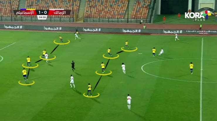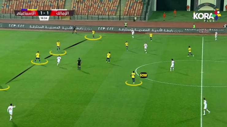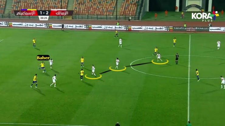 طبقنا حالات ضغط متقدم بس بشكل نادر جدًا خاصة بعد الهدف التاني للزمالك، كنا بنضغط بكل 4231، بدخول ياو انور لعمق الملعب وتقدم خط الدفاع لمنتصف الملعب.