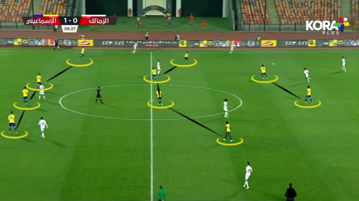 كان ده نظام الضغط الأبرز أول نص ساعة الشوط الأول ومكناش بنعمل ضغط متقدم، كنا بنضغط بشكل 4411 بوجود لاعب مع ارتكاز الزمالك الدفاعي ورقابة الارتكازين بتوعنا للإرتكازين اللي قدام ارتكاز الزمالك الدفاعي مع وجود خط الدفاع لعي بعد 12 ياردة من خط النص.