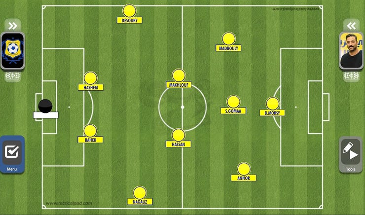 كنا بنحضر اللعب بطريقة 4222 برجوع الارتكازين أمام قلبي الدفاع ودخول مدبولي الجناح في العمق بجوار صالح جمعة مع بقاء باسم مرسي في العمق وياو انور في الطرف اليمين.