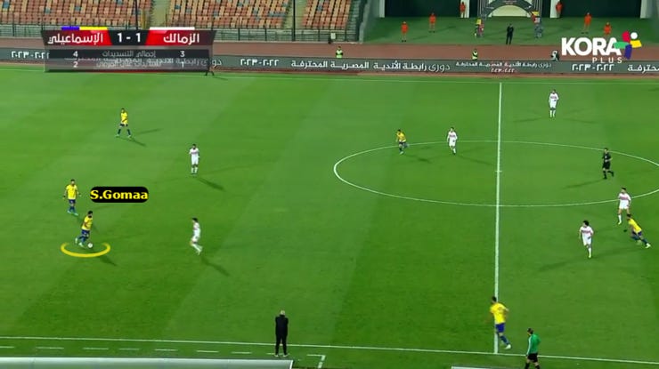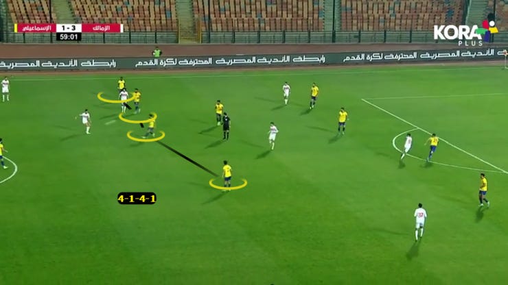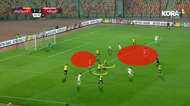الجول الثالث للزمالك جه من زيادة عددية وليهم عالطرف الشمال وتناقل الكرة اكتر من مرة فظهرت مساحات كتير في في العمق وخلف الباك اليمين، علشان كدة ده كان سبب تغيير الطريقة في الشوط التاني ل 4141 في الدفاع المنخفض.