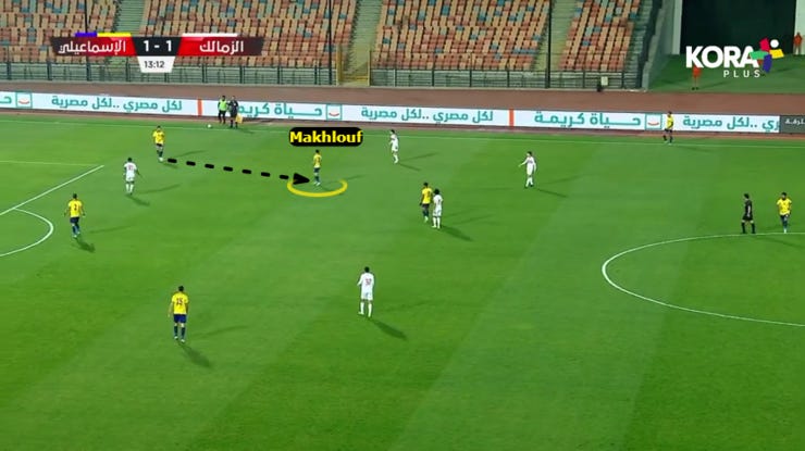 كنا بنعتمد علي حاجتين؛ الأولي .. ان لاعب من الارتكازين "مخلوف" يظهر قدام المساك علشان يستلم منه .. او يستلم من الباك لما المساك يباصيها عالطرف. ومن ثم يباصي نعكس الكرة الناحية التانية من الملعب.